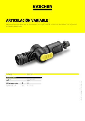 Articulación variable ajustable 180º sin escalonamiento para limpiar puntos de difícil acceso, como por ejemplo persianas enrollables, techos de coches o porches acristalados. Para conectar entre la pistola de alta presión y los accesorios, o entre la prolongación de tubos pulverizadores y los accesorios. La articulación variable permite una limpieza ergonómica.