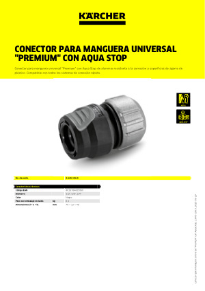 Conectar, desconectar o reparar con máxima facilidad – gracias al práctico y ergonómico conector para manguera universal «Premium» con Aqua Stop de Kärcher. De aluminio resistente a la corrosión y superficies de agarre de plástico suave para un manejo cómodo. Este sistema de conexión flexible facilita considerablemente el riego de cualquier tipo de jardín o superficie, pues unos conectores para grifos y mangueras estancos y perfectamente compatibles son la base de cualquier buen sistema de riego. El conector para manguera universal Premium con Aqua Stop es compatible con los tres diámetros de manguera más usuales y todos los sistemas de conexión rápida existentes en el mercado.