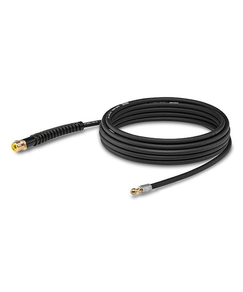 Juego para la limpieza de tuberías para limpiar tuberías, desagües, bajantes y retretes y eliminar atascos. Cuatro chorros de alta presión orientados hacia atrás desplazan la manguera por la tubería deshaciendo el atasco. Una marca continua y un anillo de marcación señalan la posición dentro de la tubería. Esta flexible manguera de calidad de 7,5 m está reforzada con trenzado textil y cuenta con una boquilla de latón extracorta para una óptima movilidad dentro de la tubería. La manguera cuenta, además, con protección contra flexiones y conexión de latón para una larga vida útil. Adecuado para utilizar en la casa y en exteriores con todas las limpiadoras de alta presión Consumer de Kärcher de las clases K2-K7.