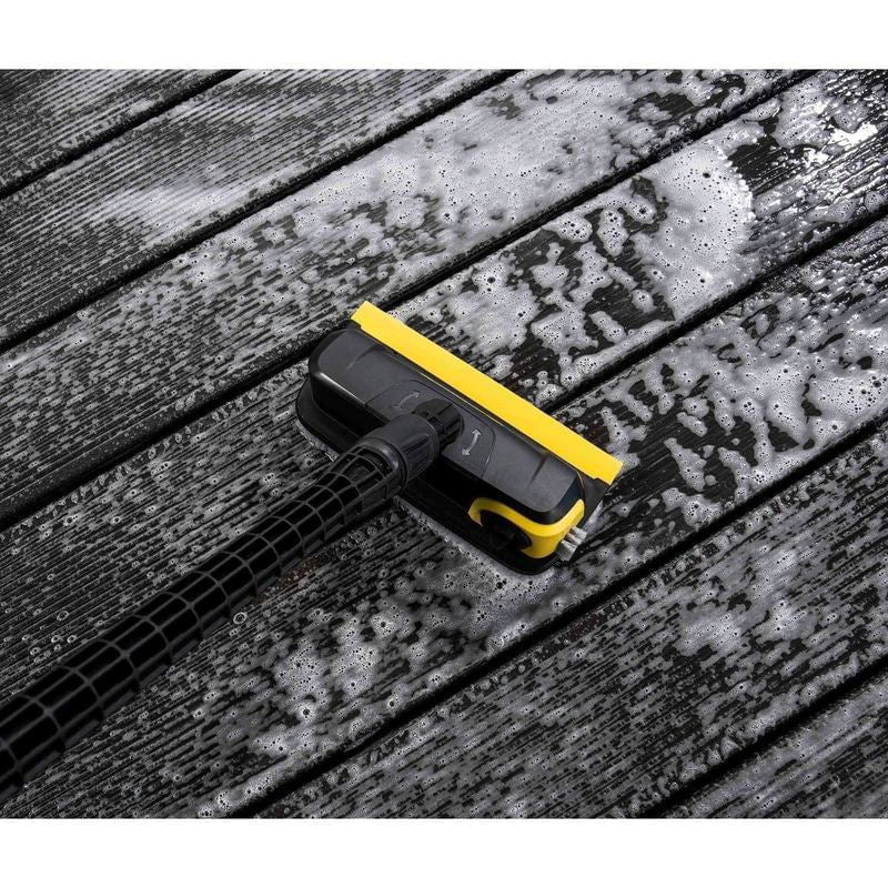 La potente escoba de exterior Power Scrubber PS 30 Plus elimina la suciedad resistente con sus tres boquillas de alta presión. La boquilla lateral orientable permite la limpieza fácil de esquinas y bordes.