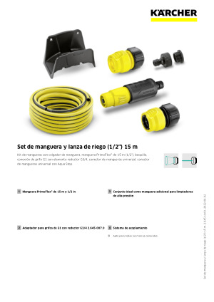 Kit de mangueras con colgador de manguera: ideal como manguera de entrada para una limpiadora de alta presión. El kit de mangueras se compone de un colgador de manguera, una manguera PrimoFlex® de 15 m (1/2″), una boquilla, una conexión de grifo G1 con elemento reductor G3/4, un conector de mangueras universal y un conector de mangueras universal con Aqua Stop. Las mangueras de riego de la línea de riego de Kärcher destacan por ser extremadamente flexibles, robustas y resistentes al doblado. Las ventajas son evidentes: larga vida útil y un manejo sencillo para un cuidado de jardines de primera. Porque regar con Kärcher es regar con inteligencia.