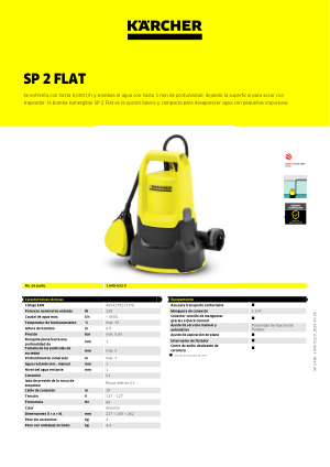 La bomba sumergible SP 2 Flat con seguridad ayuda a bombear agua limpia y con pequeñas impurezas de partículas de hasta 5 mm. Con hasta 6,000 l/h es lo ideal para drenar pequeñas albercas o estanques llenos con agua que ingresa del subsuelo o de fugas de equipos con agua. Un robusto sello circular deslizable le proporciona a la bomba una vida útil mayor. El interruptor de flotador enciende y apaga la bomba automáticamente dependiendo del nivel de agua, previniendo que trabaje en seco. Y gracias a la posibilidad fijar el interruptor de flotador, también puede ser usada en niveles bajos de agua en operación continua. La SP 2 Flat también cuenta con patas plegables, que pueden utilizarse para lograr una mayor capacidad. Cuando las patas están plegadas, la bomba de agua sumergible comienza a operar a una profundidad de agua de 7 mm y en bombas en trabajo continuo hasta 1 mm, dejando la superficie para secar con trapeador. Y la conexión de rosca con Quick Connect permite que mangueras de 1 1/4″ sean rápida y fácilmente conectadas.